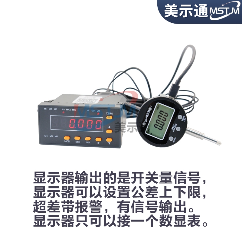 显示器可以设置公差上下线,超差带报警,带RS232通讯接口输出,采用MODBUS通讯协议。显示器输出的是开关量信号,显示器只可以接一个数显表或测微计。