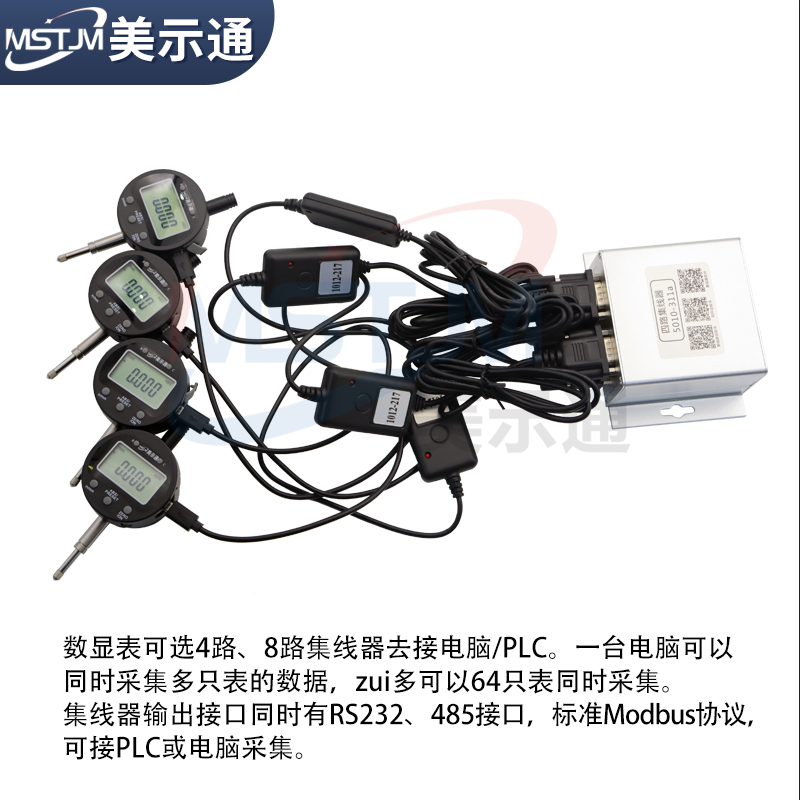 集线器输出的是标准的Modbus协议,有232出口和485出口。集线器可以接1个测微计或多个测微计同时接PLC通讯或电脑采集数据,集线器有4路和8路之分。