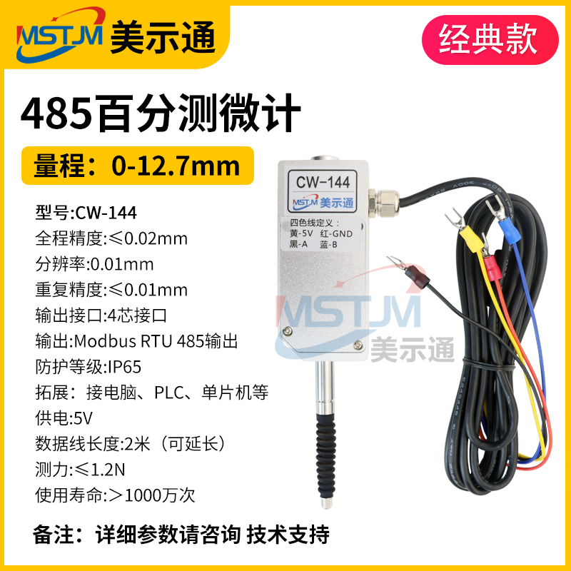 美示通经典款485测微计通讯协议,数据帧格式:MODBUS RTU模式。通讯参数波特率 38400。数据帧 1个起始位,8个数据位,无奇偶校验,2个停止位。引线定义:黄5V(电源),红GND(地),黑A+,蓝B-。