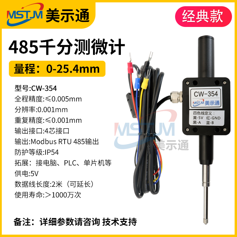 美示通经典款485测微计通讯协议,数据帧格式:MODBUS RTU模式。通讯参数波特率 38400。数据帧 1个起始位,8个数据位,无奇偶校验,2个停止位。引线定义:黄5V(电源),红GND(地),黑A+,蓝B-。