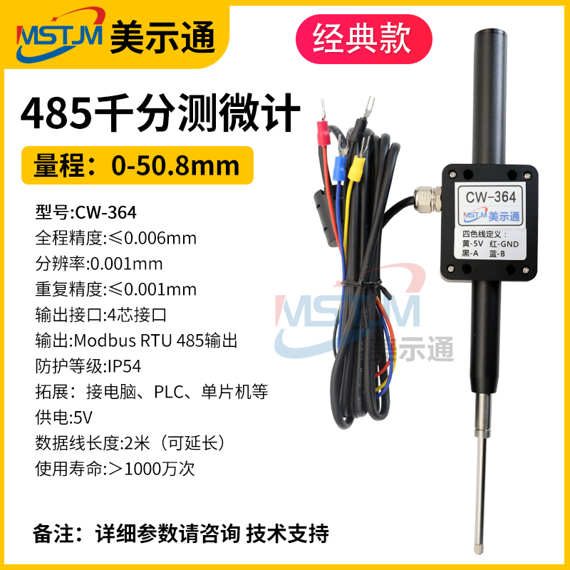 美示通经典款485测微计通讯协议,数据帧格式:MODBUS RTU模式。通讯参数波特率 38400。数据帧 1个起始位,8个数据位,无奇偶校验,2个停止位。引线定义:黄5V(电源),红GND(地),黑A+,蓝B-。