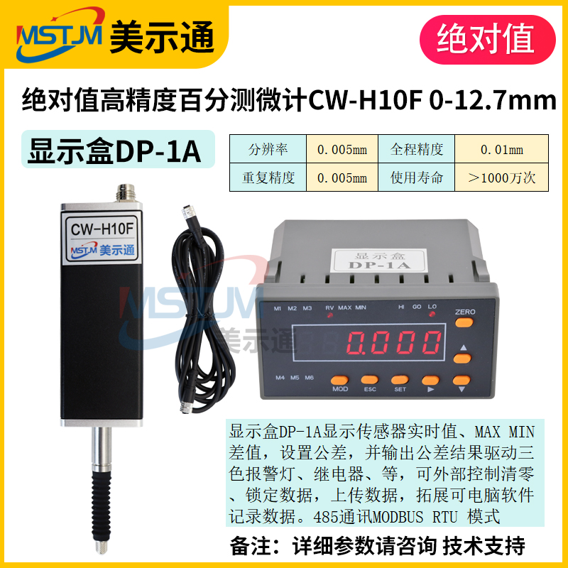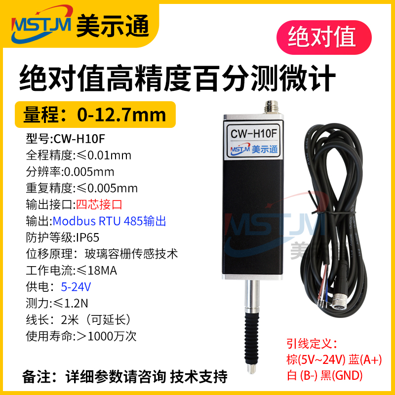 美示通485绝对值测微计通讯协议,MODBUS RTU模式;通讯参数:波特率(Baud =38400) ;数据帧:1个起始位,8个数据位,无奇偶校验(Parity=0),1个停止位;地址: 1。可设置站号地址和串口通讯参数等。数据更新速度默认8ms(125次/S),最快可设4ms(125次/S);反复使用寿命500 万次,工业自动化好帮手。引线定义: 棕(5V~24V) 蓝(A+) 白 (B-) 黑(GND)