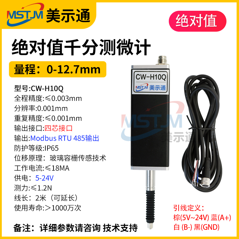 美示通485绝对值测微计通讯协议,MODBUS RTU模式;通讯参数:波特率(Baud =38400) ;数据帧:1个起始位,8个数据位,无奇偶校验(Parity=0),1个停止位;地址: 1。可设置站号地址和串口通讯参数等。数据更新速度默认8ms(125次/S),最快可设4ms(125次/S);反复使用寿命500 万次,工业自动化好帮手。引线定义: 棕(5V~24V) 蓝(A+) 白 (B-) 黑(GND)