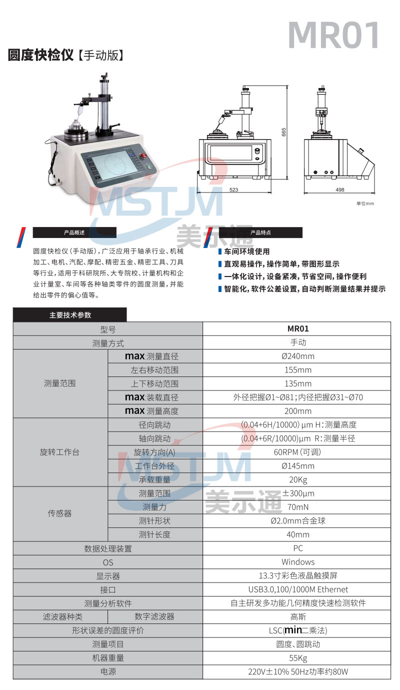 美示通手动标准版圆度仪广泛应用于轴承行业、机械加工、电机、汽配、摩配、精密五金、精密工具、刀具、模具、光学元件等行业。适用于科研院所、大专院校、计量机构和企业计量室、车间等各种环形工件的圆度测量,并能给出零件的偏心值等。