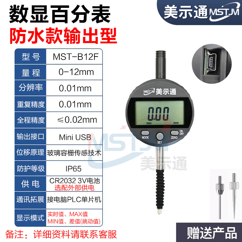 美示通防水型数显量表:1、超大数字显示2、预置实际位置数值3、大容量3伏锂电池4、自动/手动关机5、玻璃容栅传感器6、绝对和相对测量,任意位置公英制转换7、标准数据输出口8、航空铝合金主体,高防护、耐久使用寿命9、防水、防油、防尘 ,防护等级:IP65(0-12.7mm), IP54(0-25.4mm,0-50.8mm)