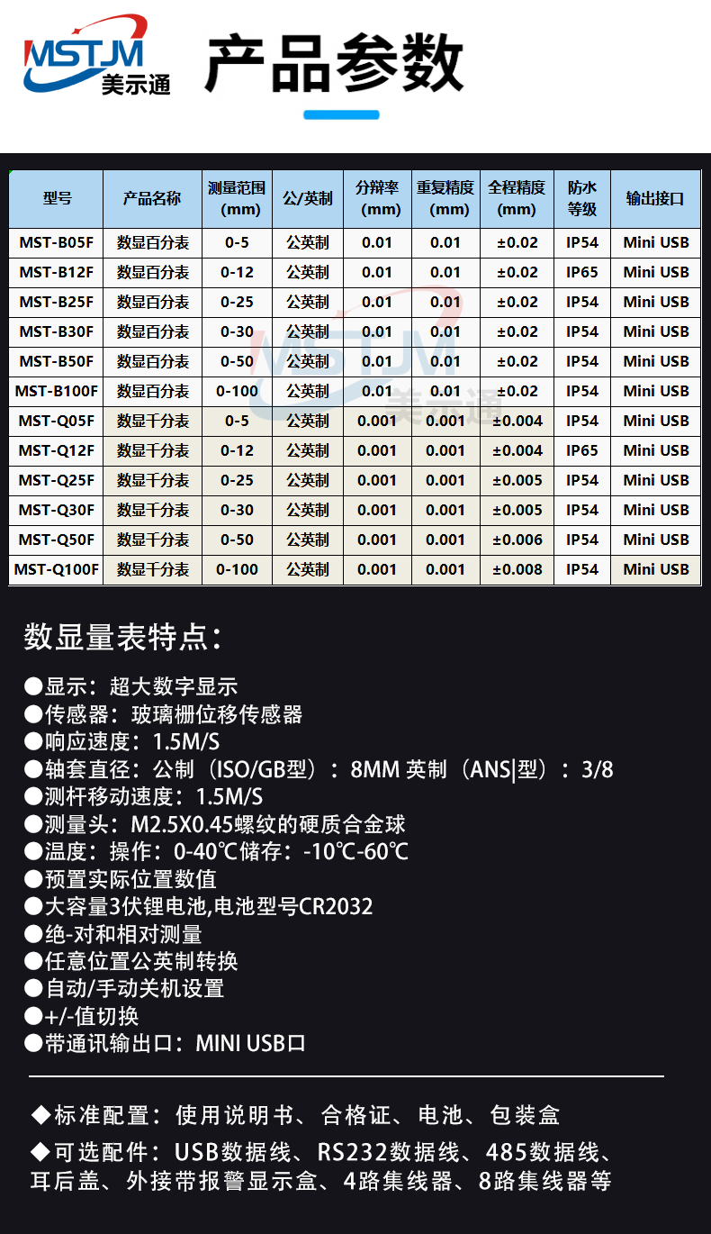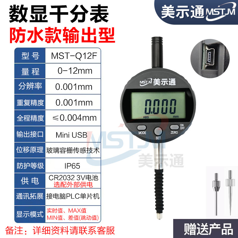 美示通防水型数显量表:1、超大数字显示2、预置实际位置数值3、大容量3伏锂电池4、自动/手动关机5、玻璃容栅传感器6、绝对和相对测量,任意位置公英制转换7、标准数据输出口8、航空铝合金主体,高防护、耐久使用寿命9、防水、防油、防尘 ,防护等级:IP65(0-12.7mm), IP54(0-25.4mm,0-50.8mm)