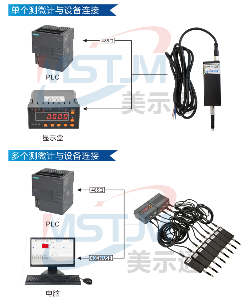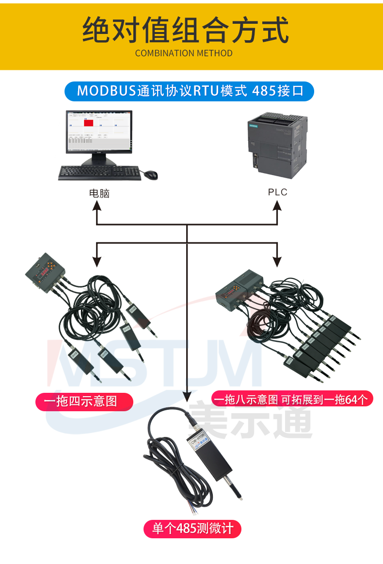 美示通485绝对值测微计主要功能: 1、高精度位移测量,绝对原点技术2、可与 PLC 、上位机软件、触摸屏等通讯,协议为Modbus RTU3、可软件设置站号地址和串口通讯参数等技术指标:1、接口形式:RS485接口2、通讯协议:MODBUS RTU3、工作电压范围:DC5V~24V4、从站可调范围:1-2475、波特率可调范围:9600-1152006、工作电流:<10mA7、数据更新速度:默认8ms(125次/S),最快可设4ms(250次/S)8、使用寿命:反复测量500万次9、检测系统:容栅测量系统,玻璃材料传感器引线定义: 棕(5V~24V) 蓝(A+) 白 (B-) 黑(GND)