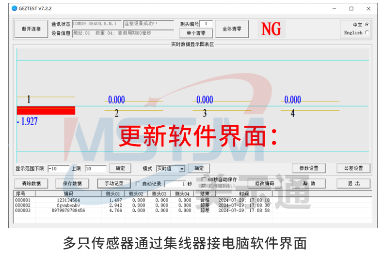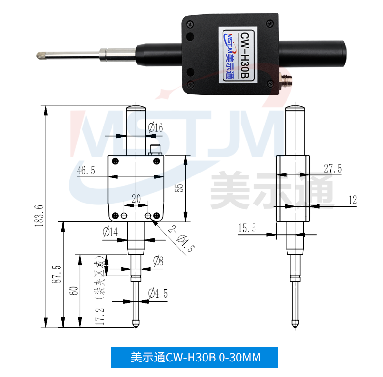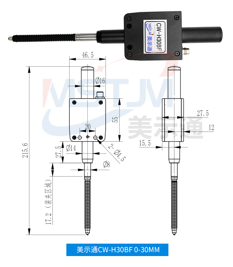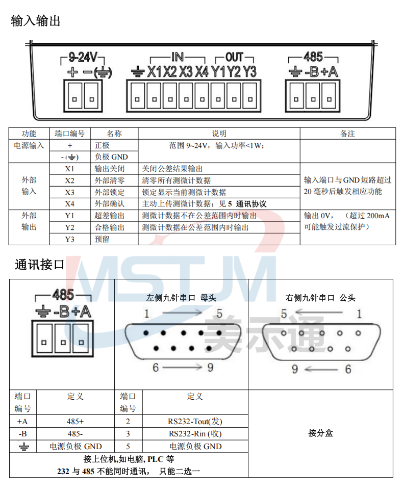 美示通485绝对值测微计主要功能: 1、高精度位移测量,绝对原点技术2、可与 PLC 、上位机软件、触摸屏等通讯,协议为Modbus RTU3、可软件设置站号地址和串口通讯参数等技术指标:1、接口形式:RS485接口2、通讯协议:MODBUS RTU3、工作电压范围:DC5V~24V4、从站可调范围:1-2475、波特率可调范围:9600-1152006、工作电流:<10mA7、数据更新速度:默认8ms(125次/S),最快可设4ms(250次/S)8、使用寿命:反复测量500万次9、检测系统:容栅测量系统,玻璃材料传感器引线定义: 棕(5V~24V) 蓝(A+) 白 (B-) 黑(GND)