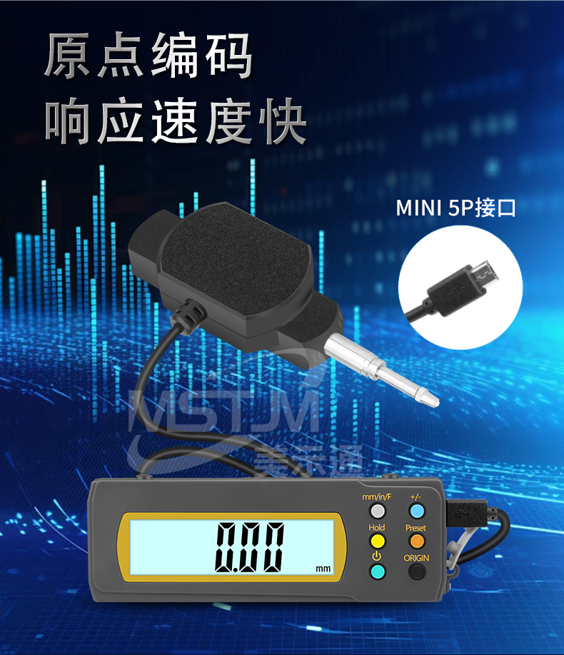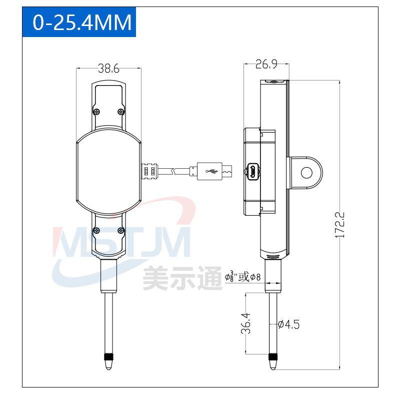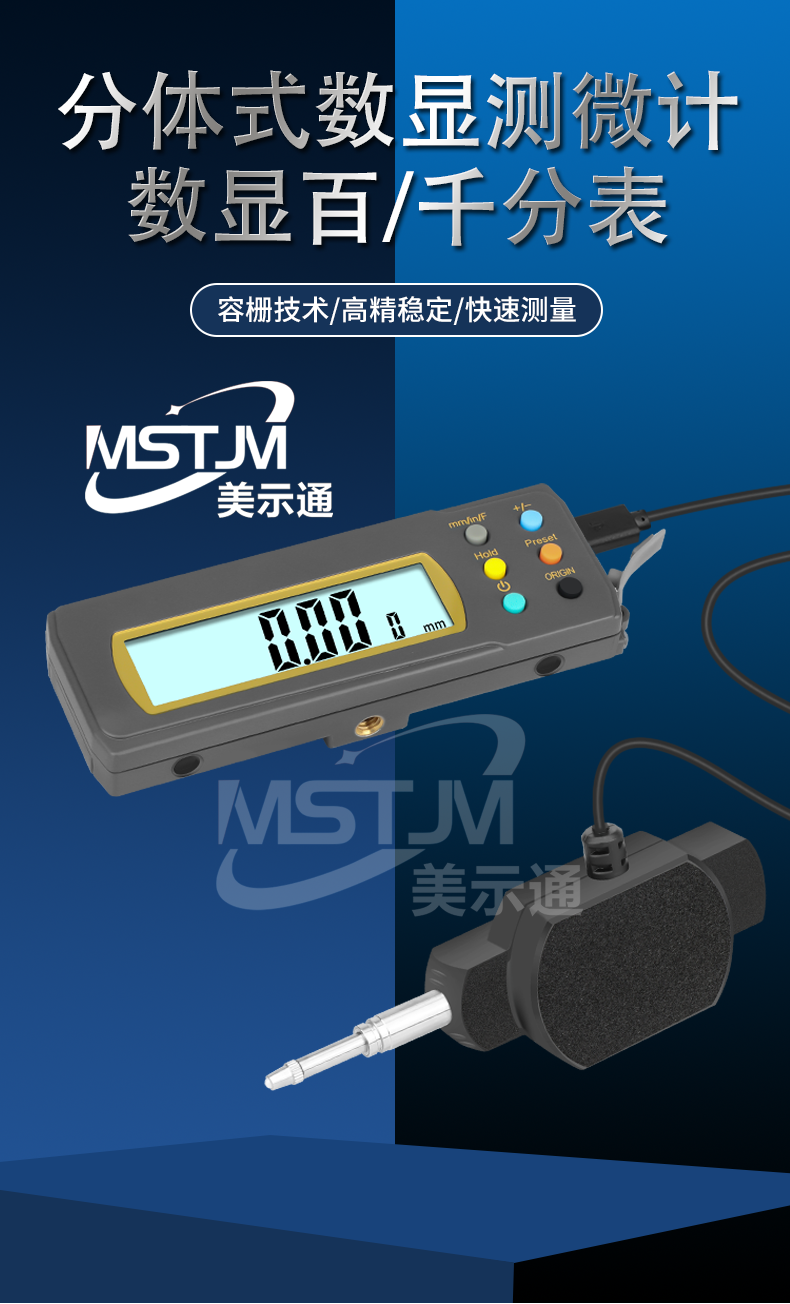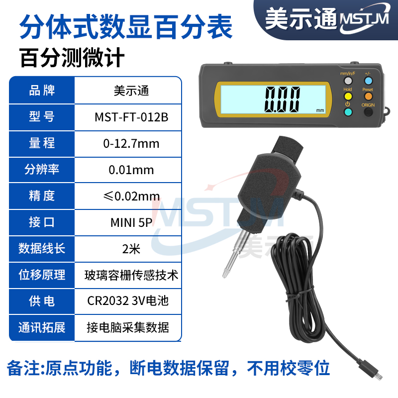 美示通品牌分体式数显百分表千分表,量程0-12.7mm 0-25.4mm ,数据线线长2米,可通过数据装置或无线发射器接收器在电脑EXCEL中手动采集数据。