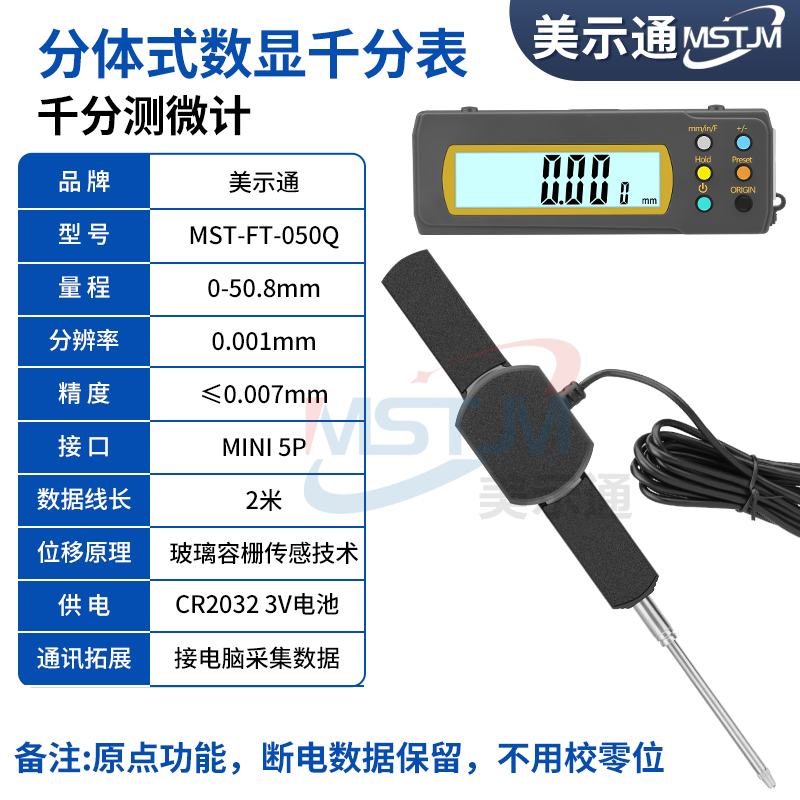 美示通品牌分体式数显百分表千分表,量程0-12.7mm 0-25.4mm ,数据线线长2米,可通过数据装置或无线发射器接收器在电脑EXCEL中手动采集数据。