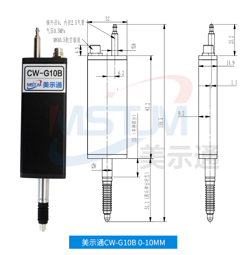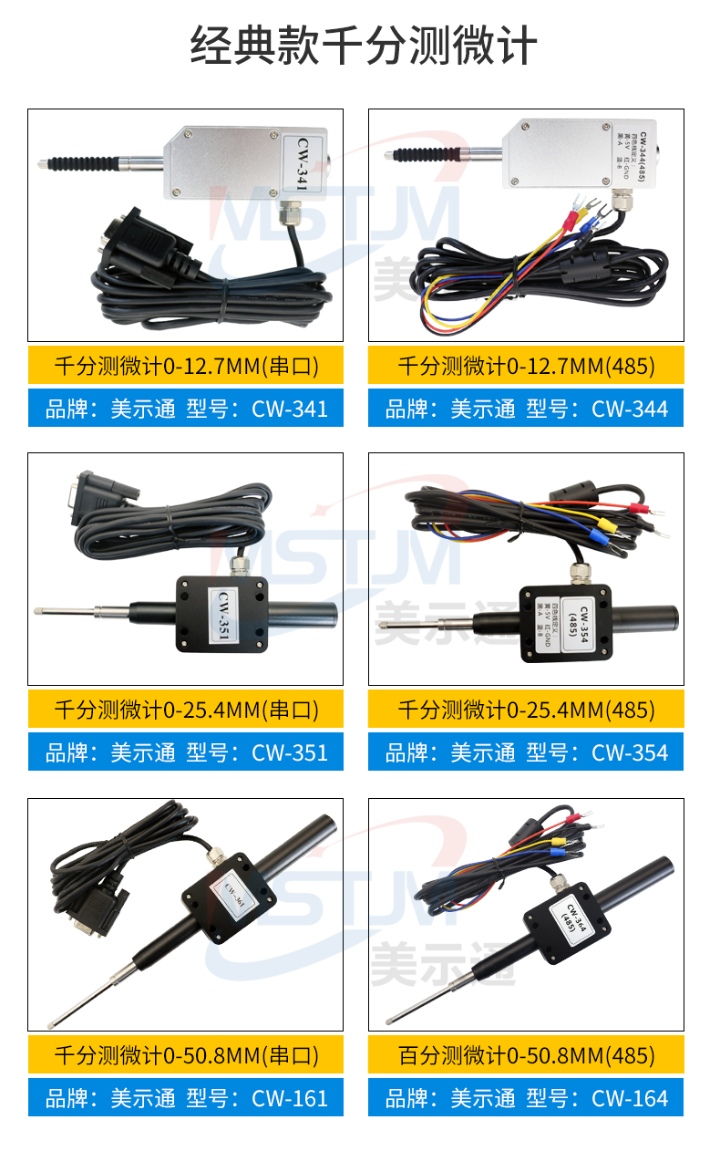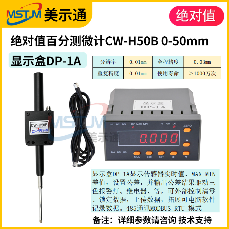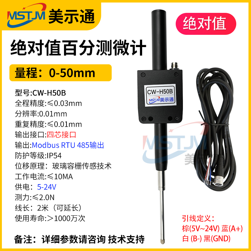 美示通485绝对值测微计主要功能: 1、高精度位移测量,绝对原点技术2、可与 PLC 、上位机软件、触摸屏等通讯,协议为Modbus RTU3、可软件设置站号地址和串口通讯参数等技术指标:1、接口形式:RS485接口2、通讯协议:MODBUS RTU3、工作电压范围:DC5V~24V4、从站可调范围:1-2475、波特率可调范围:9600-1152006、工作电流:<10mA7、数据更新速度:默认8ms(125次/S),最快可设4ms(250次/S)8、使用寿命:反复测量500万次9、检测系统:容栅测量系统,玻璃材料传感器引线定义: 棕(5V~24V) 蓝(A+) 白 (B-) 黑(GND)