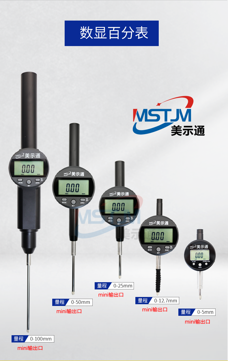 美示通防水型数显量表:1、超大数字显示2、预置实际位置数值3、大容量3伏锂电池4、自动/手动关机5、玻璃容栅传感器6、绝对和相对测量,任意位置公英制转换7、标准数据输出口8、航空铝合金主体,高防护、耐久使用寿命9、防水、防油、防尘 ,防护等级:IP65(0-12.7mm), IP54(0-25.4mm,0-50.8mm)